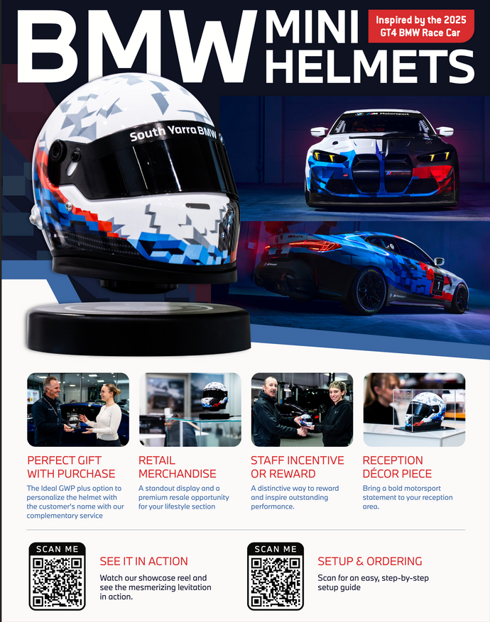 BMW Dealership creates the perfect gift with purchase, staff incentive, and retail item, with a BMW branded mini helmet with floating stand.