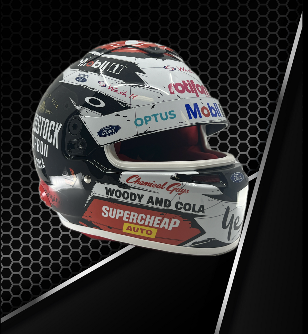 A full-size replica of Chaz Mostert’s 2023 Woodstock Bourbon helmet. Optional Extra Clear Display Case and Official Woodstock Bourbon Plaque. Limited Units Available.