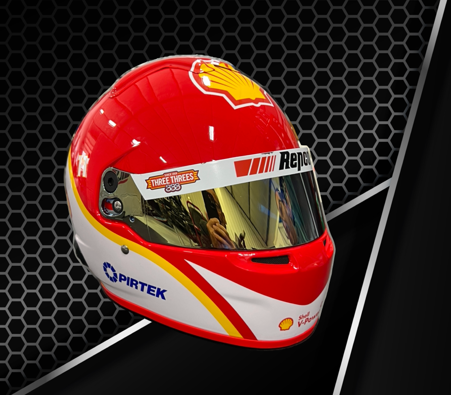 2023 Shell V Power 1:1 scale replica helmet. Design based on the current SVP Ford Mustang. Comes with a gold visor. Plus optional extra display case. Instock